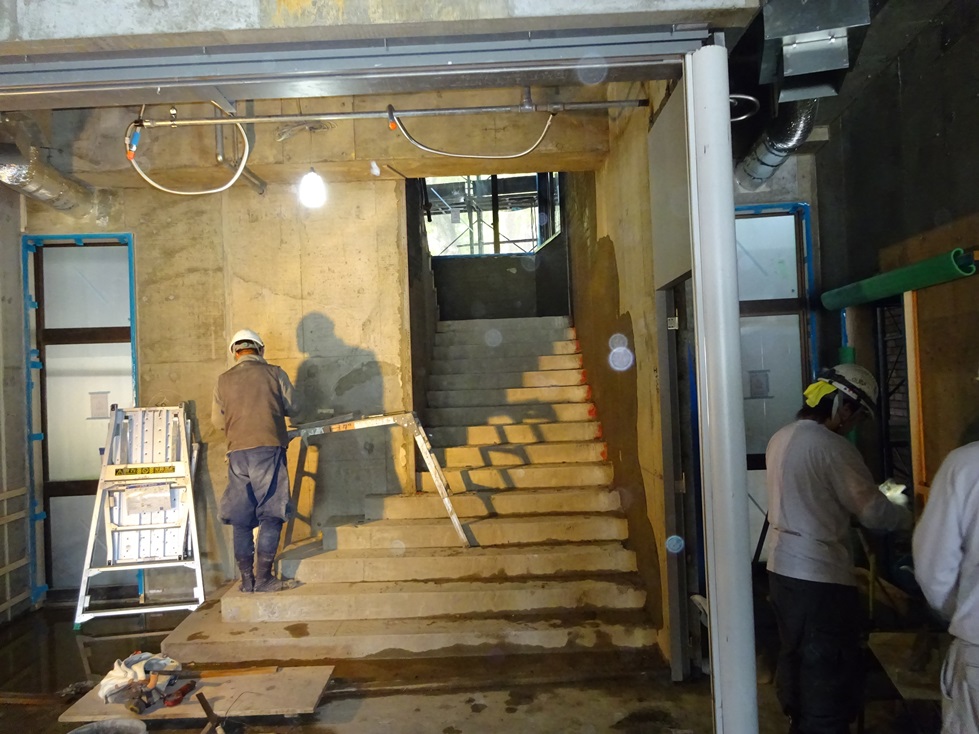 中央階段はガラス張りなので、外の景色が良く見え、建物北側の大きな楠が一望できます